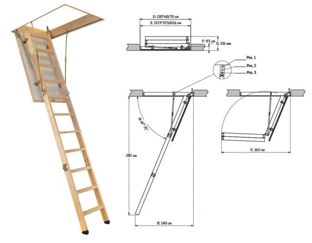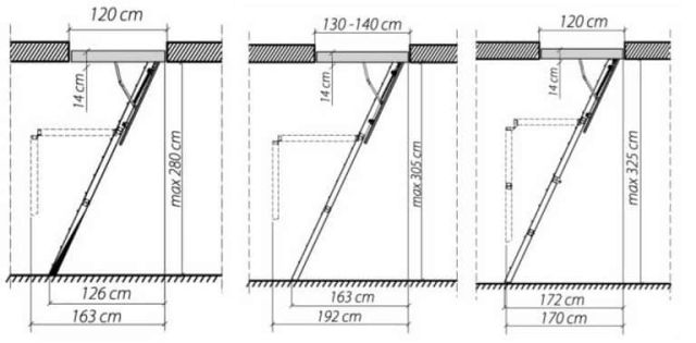Таким образом, можно сказать, что стандартными размерами люка будут 60х120 см, 60х130 см, 60х140 см, а также 70х120 см, 70х130 см и 70х140 см. Длина лестницы будет зависеть от стандартных размеров потолков, под которые выбирается конкретная модель. Так, для потолков высотой 305 см и опорного расстояния лестницы под люком 163 см, этот показатель составит 363,6 см.