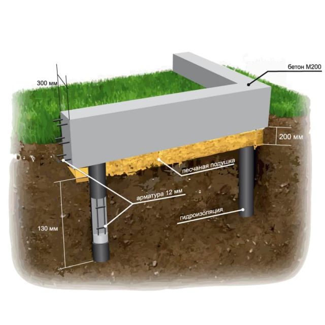 Мелко- или незаглубленный. Тут столбы устанавливаются над уровнем промерзания грунта и лента фундамента получается неглубокой. Именно эта разновидность свайно-ростверкового фундамента чаще всего используется в частном строительстве и ещё иногда называется свайно-ленточным основанием. Сразу хотим предупредить, что несмотря на своё значительное распространение, уместность использования данной технологии под большим вопросом, о чём в подробностях рассказано в последующих разделах.