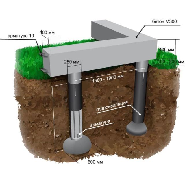 Заглубленный. Изготовление столбов происходит так, чтобы верхняя их граница находилась под уровнем промерзания грунта. Таким образом, связывающая их лента фундамента будет достаточно глубокой, чтобы предотвратить деформацию основания под воздействием сезонных изменений уровня грунта. В этом виде свайно-ростверковый тип фундамента используется при строительстве тяжелых зданий, так как требует большого количества бетона для создания глубокой ленты. Кроме затрат на большой ростверк, немало средств потребуется вложить и в установку свай.