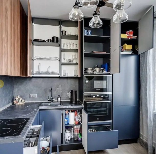 Выбирайте технику по реальной потребности. Вместо громоздких гаджетов отдайте предпочтение встроенным решениям — они экономят пространство и выглядят аккуратно. Подумайте о многоуровневых ящиках и выдвижных системах, они значительно упрощают доступ к посуде и сыпучим продуктам.