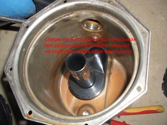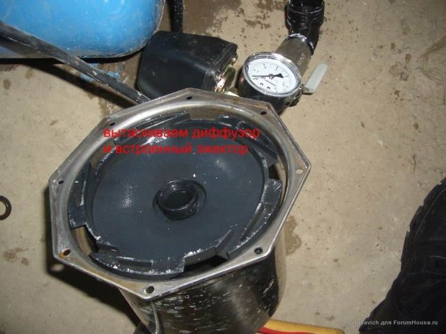 После чего насос включается на полную мощность и на манометре фиксируется показатель давления, которое он развивает. Для получения именно максимального значения, следует заблокировать реле давления в рабочем положении. При значительном отличии максимального давления, которое выдает насос, от указанного в паспорте, очевидно необходима замена каких-либо комплектующих внутри конструкции. Рассмотрим последовательность замены детали на примере установки нового эжектора.