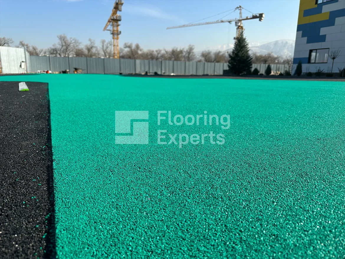Монтаж начинается с ровного основания: бетон или геотекстиль с песчано-гравийной прослойкой. Затем наносится связующее и крошка уплотняется. Толщина слоя выбирается в зависимости от зон игры и максимальной высоты падения.