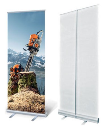 Ролл‑ап стенд — это не про сложные крепления или набор инструментов. Полотно хранится на рулоне в основании, откуда его можно вытащить и закрепить вертикальной штангой. За минуту готово мобильное рекламное поле.