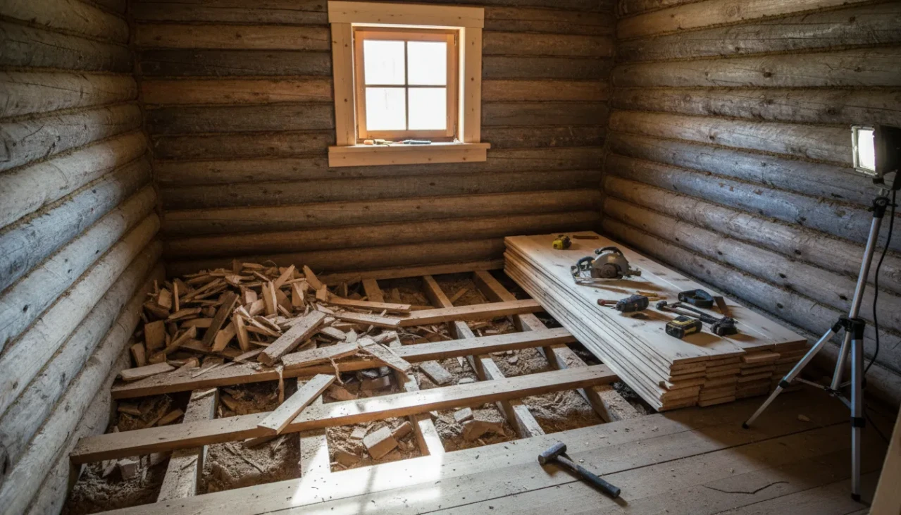 Полы в бане разрушаются быстрее всех конструкций — постоянная влага и перепады температур делают своё дело. Деревянные половицы в моечной и парилке меняйте полностью, даже если внешне они выглядят прилично. Вскройте покрытие и проверьте лаги — влажная, мягкая древесина говорит о гниении. Лаги не ремонтируют — только полная замена с утеплителем.