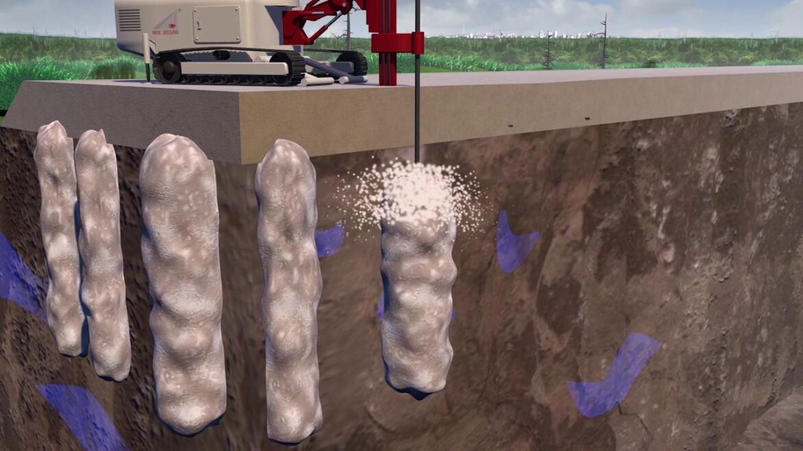 Цементный раствор подается в грунт с использованием специальных установок. Равномерное распределение смеси в почве обеспечивает стабильное укрепление.