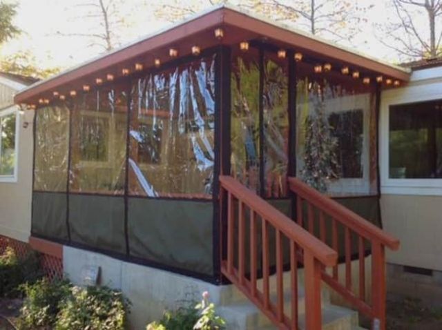 Съёмным элементом в пристройке может стать не только материал стен, но и покрытие навеса. На следующем фото хорошо видно, как полностью застекленная беседка со стеклянной дверью не имеет твердой кровли из классических материалов. В качестве покрытия на каркас навеса может быть натянут плотный пластиковый или тканевый тент.