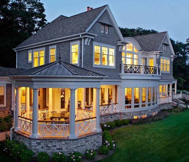 В завершении обзора хотелось бы показать, что беседки пристроенные к дому используются не только в качестве дополнительной конструкции, но предусматриваются также и в изначальных проектах больших домов с массивными колоннами.