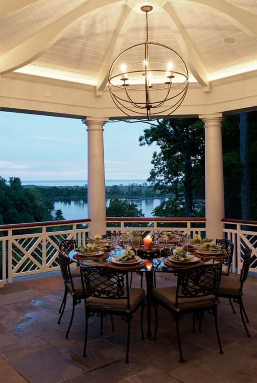 Такая просторная беседка с колоннами создает по-настоящему торжественное настроение и прекрасно подойдет для празднования значимых событий в тесном семейном кругу. Организовывая встречу друзей и родственников в доме с такой беседкой всегда можно разделить мероприятие на два отдельных этапа, один из которых пройдет на свежем воздухе, а второй можно перенести во внутренние помещения дома и продолжить общение при ярком искусственном свете.