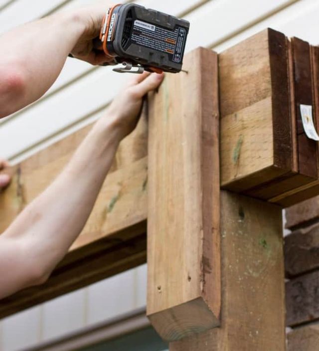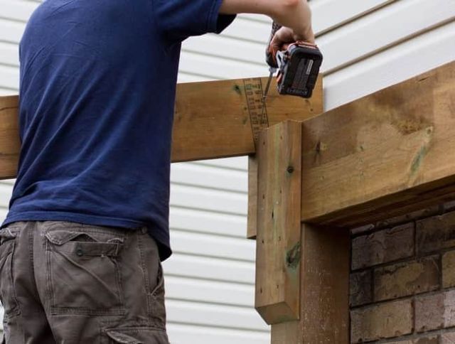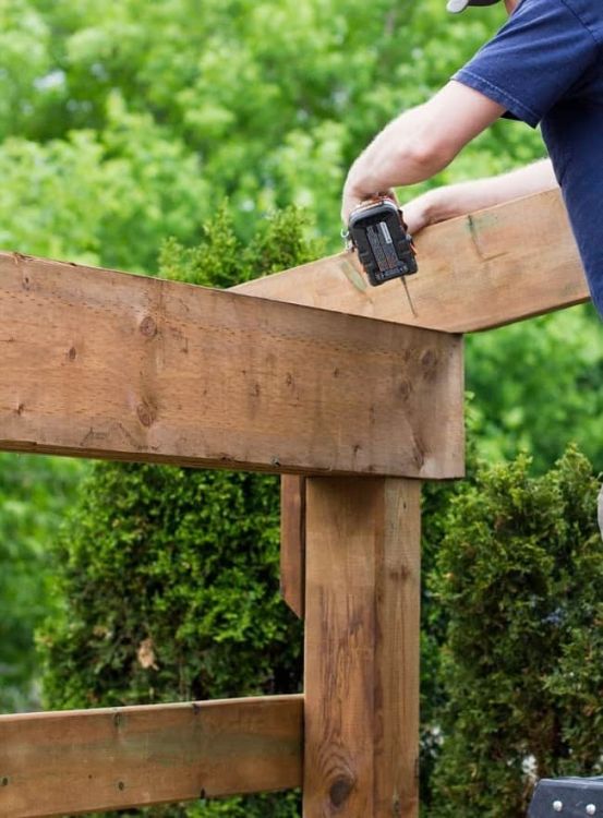 Следующим этапом идёт установка горизонтальных балок крыши. Они надежно закрепляются на вертикальных стойках с помощью небольших досок, которые вкручиваются шуруповертом в опорные балки и в перекрытия крыши.