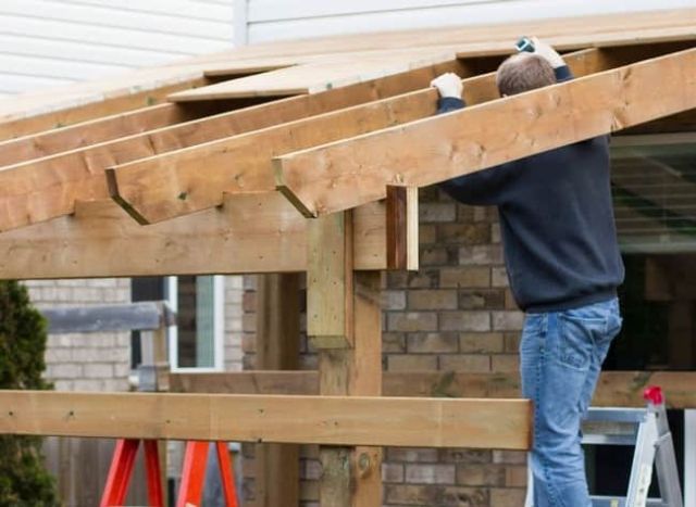 По направлению от стены дома наружу происходит монтаж ската крыши. Навес может быть установлен как под углом, так и горизонтально. Первый вариант предпочтительнее, так как сток воды будет происходить более естественно и влага не станет задерживаться на накрытии.