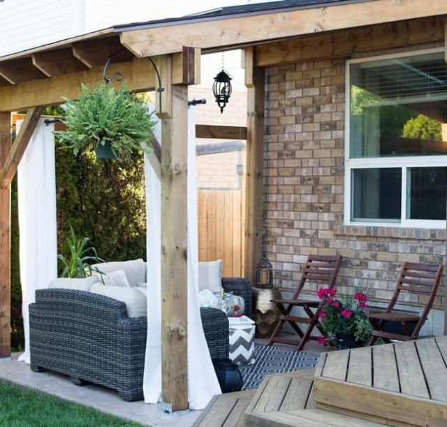 В качестве ещё одного интересного решения для обустройства летней беседки в последнее время часто используется тканевое подвесное накрытие, закрепленное на специальных карабинах под потолком. Его особенность в том, что в любой момент такой верх может быть задвинут по направляющим в сторону дома и беседка станет полностью открытой для солнечных лучей. С такой же лёгкостью навес выдвигается снова и обеспечивает надёжную защиту от дождя или слишком интенсивного солнца в жаркую погоду.
