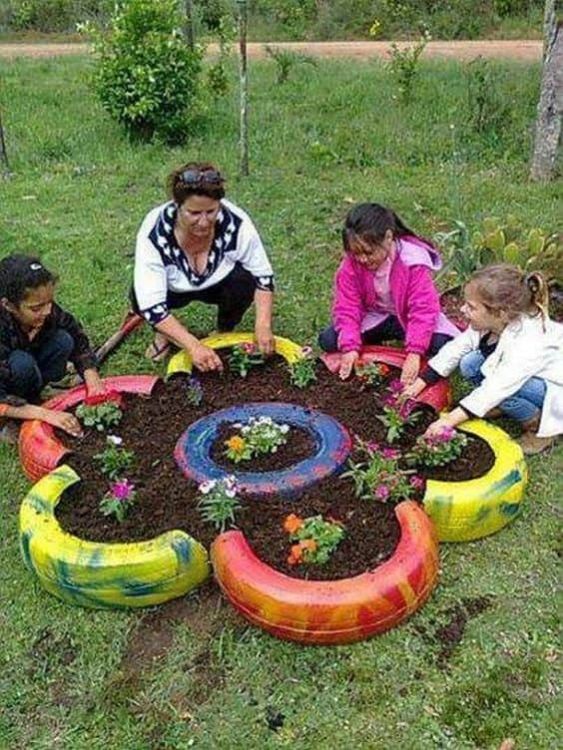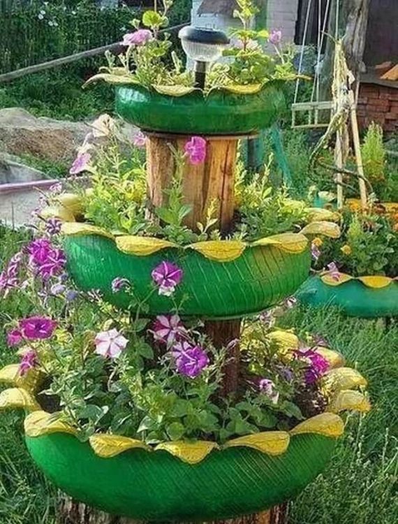 Ещё один простой способ создать большой цветник из нескольких старых покрышек.