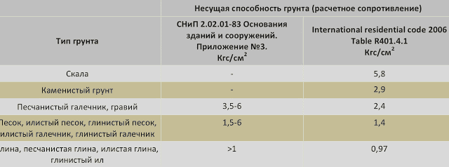 Таблица средней несущей способности различных грунтов